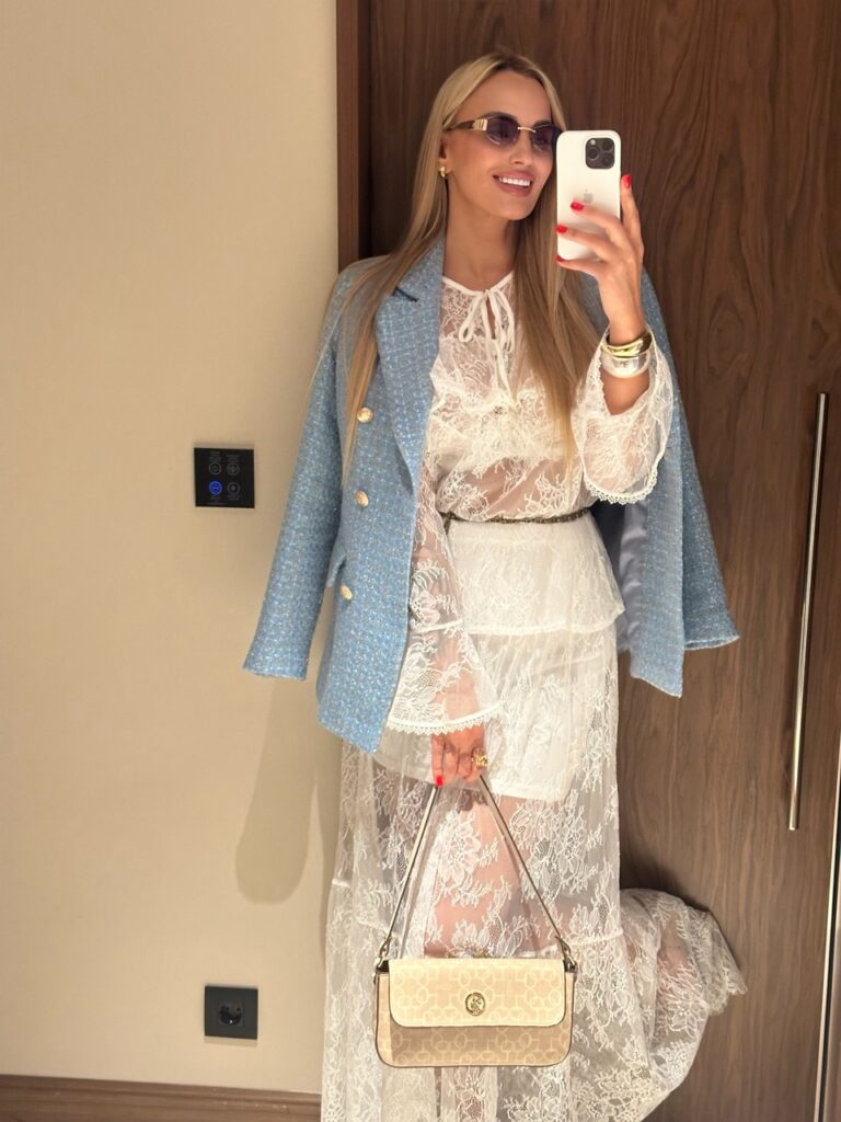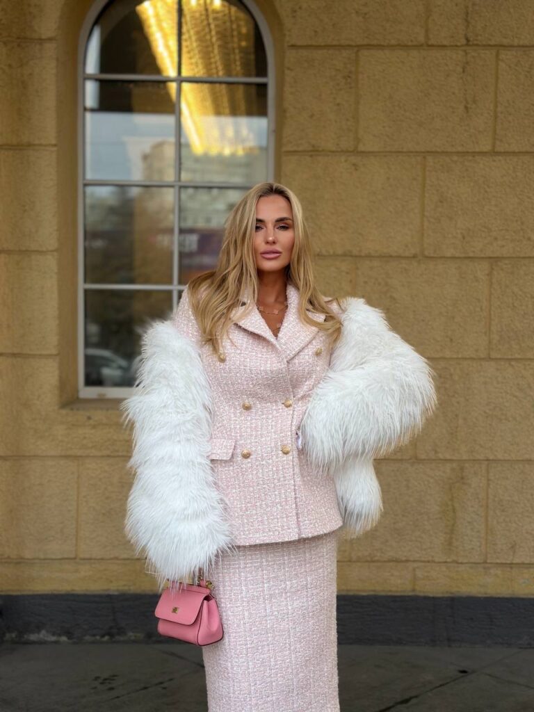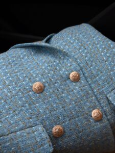 Особого внимания заслуживает фурнитура: матовые золотые пуговицы не просто выполняют практическую функцию, но и служат стильным украшением, добавляя жакету нотку роскоши. Их сдержанный блеск гармонично сочетается с текстурой твида, не перегружая образ.